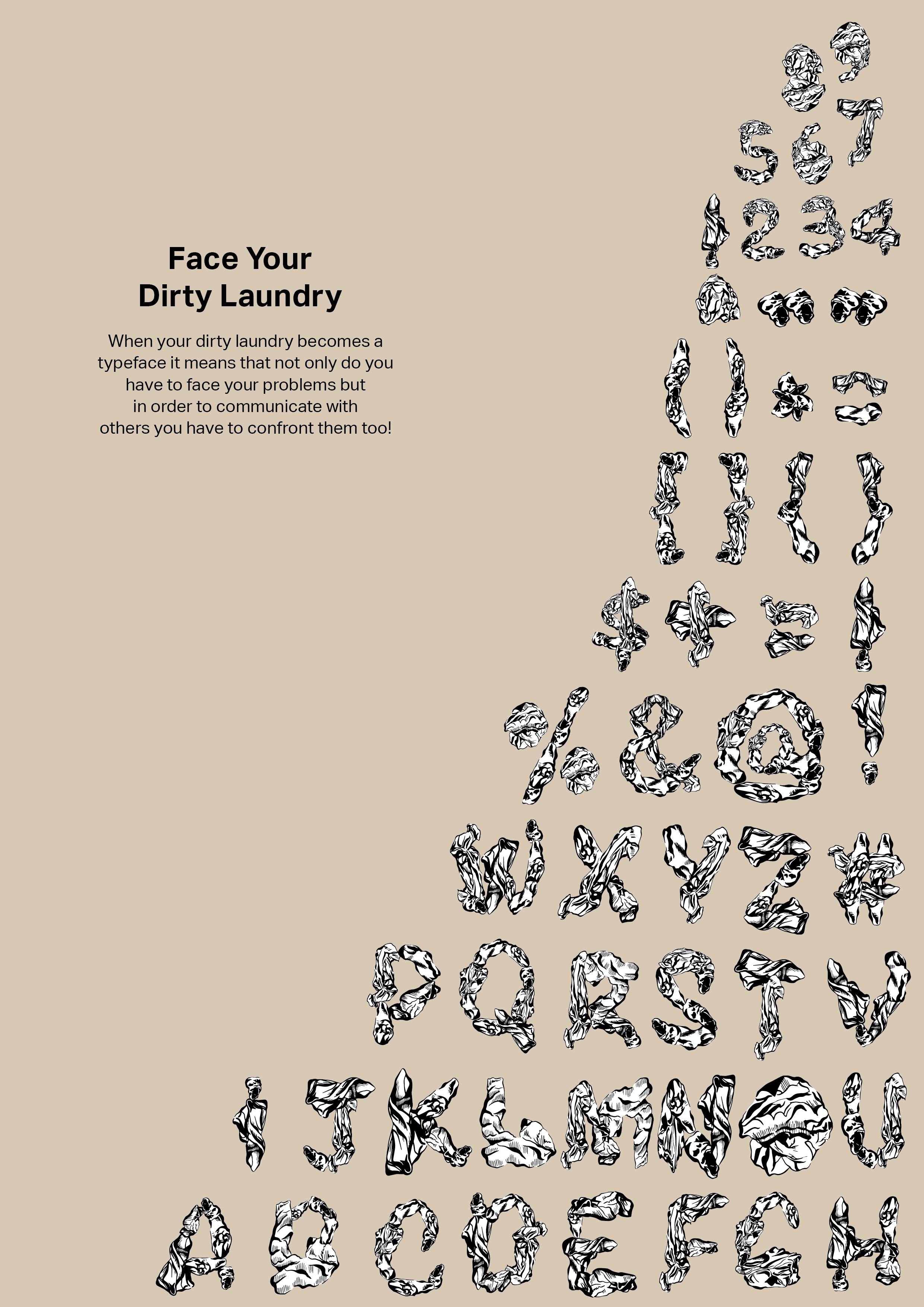 “Dirty Laundry” is a modular display typeface that is composed of abstracted sketches of my own dirty laundry. It is not against the norm to ignore one’s problem and pretend like it doesn’t exist. However, when dirty laundry becomes a typeface it urges you to face your problems in order to communicate with others.